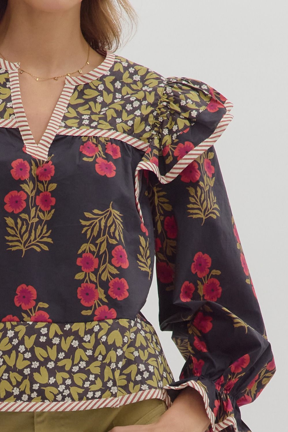 A long sleeve boho style top with a contrast floral design and striped border. Model is wearing a size small.