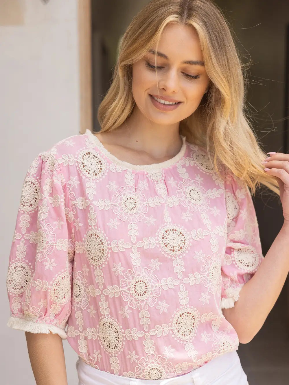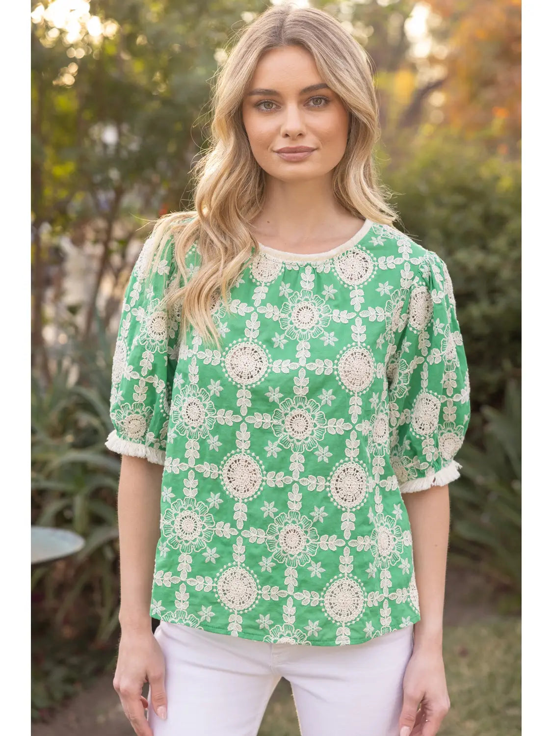 A fringe detail embroidered top with a round neckline. Comes in two colors: black and light blue, green, pink.