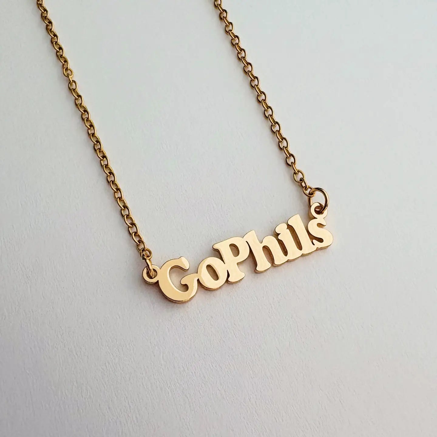 Cheer on your favorite Philly baseball team with this Go Phils necklace. Mad of gold-plated stainless steel. Hypoallergenic (lead &nickel free). 17"L plus 2" extender.