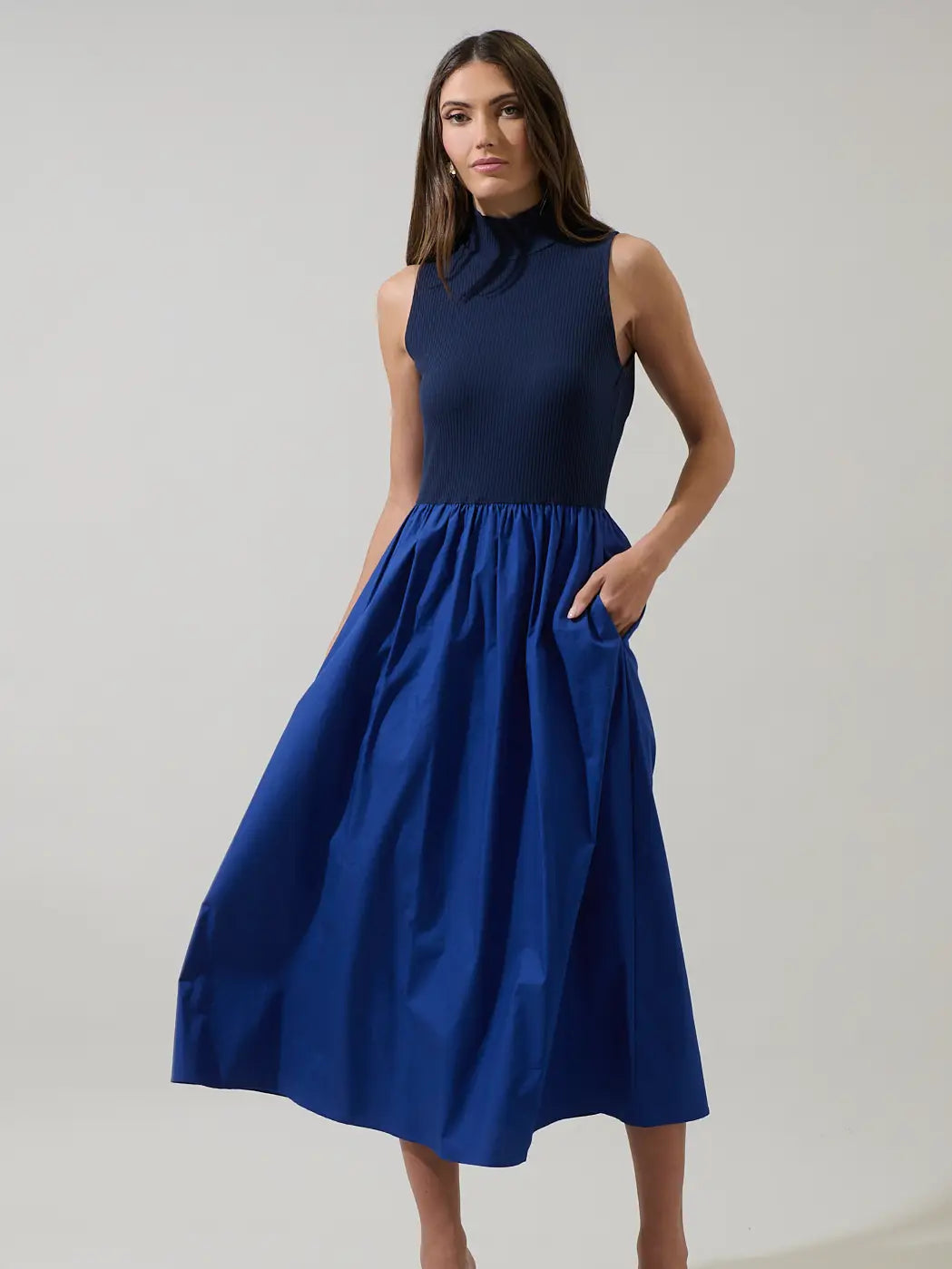 A block-colored dress with a sleek mock neck and sleeveless cut and flowy skirt with pockets. Model is wearing a size small.