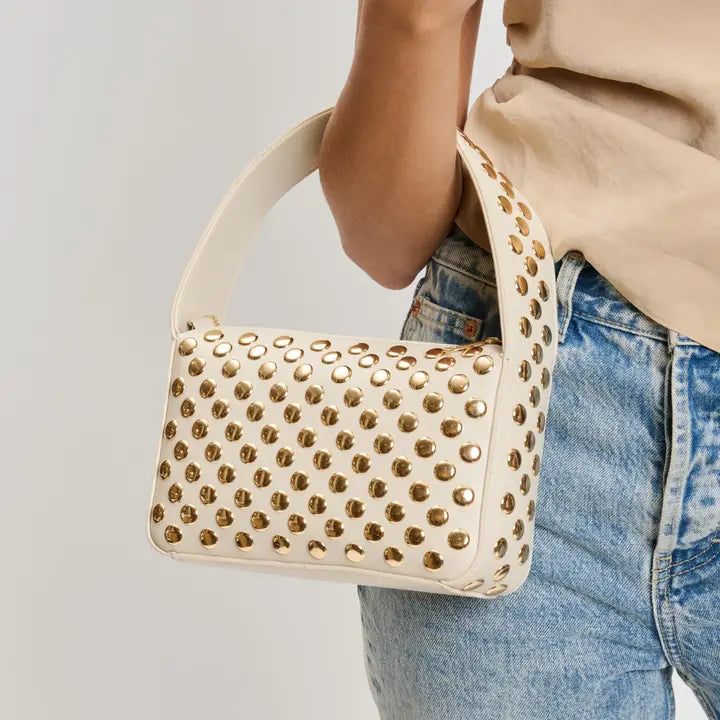 The Isabel studded bag with a detachable crossbody strap. Made from vegan leather, features gold stud embellishments, lined interior and zipper closure. Comes in 3 colors! black, chocolate and oatmilk.