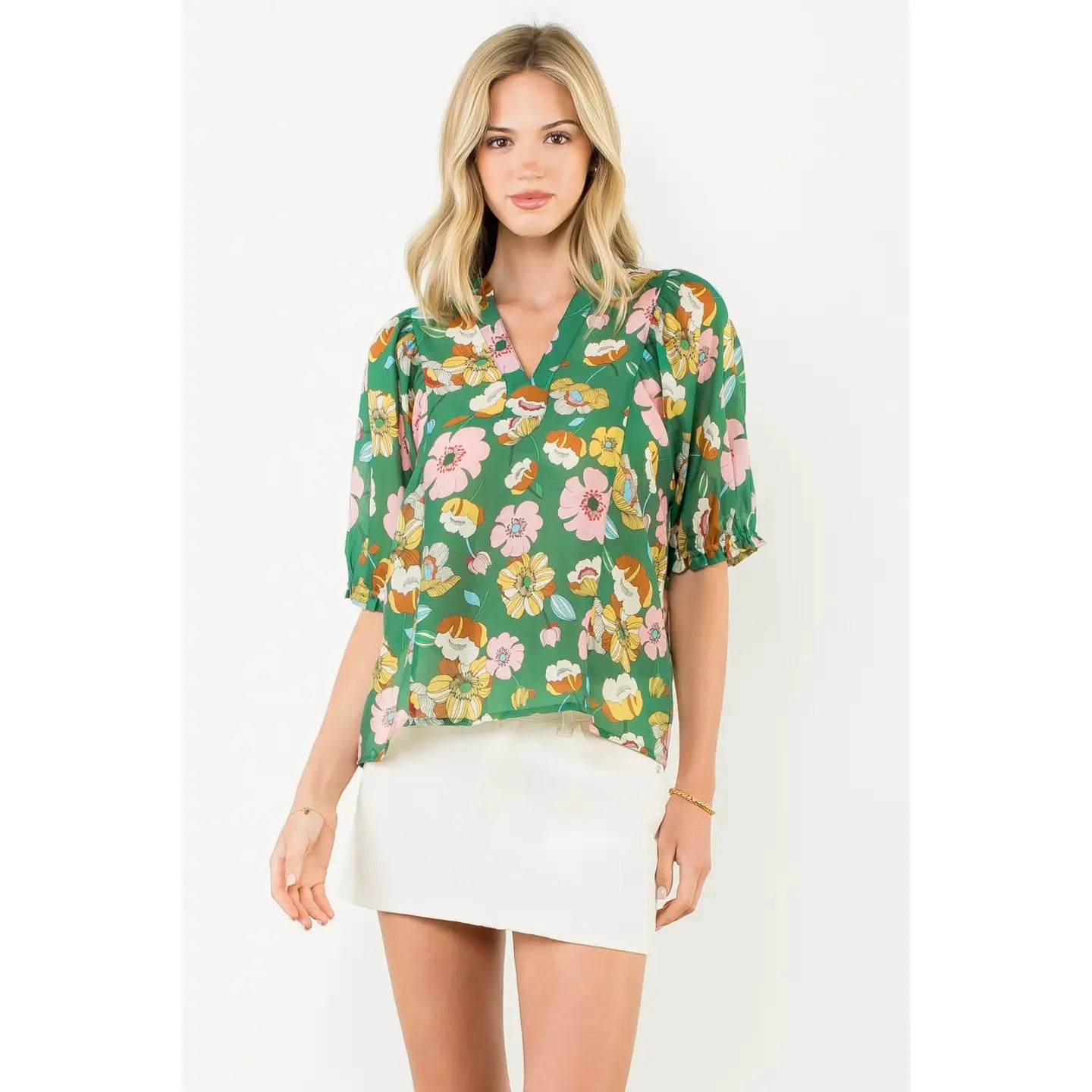A floral shirred sleeve top with a v-neckline. Model is wearing a size small.