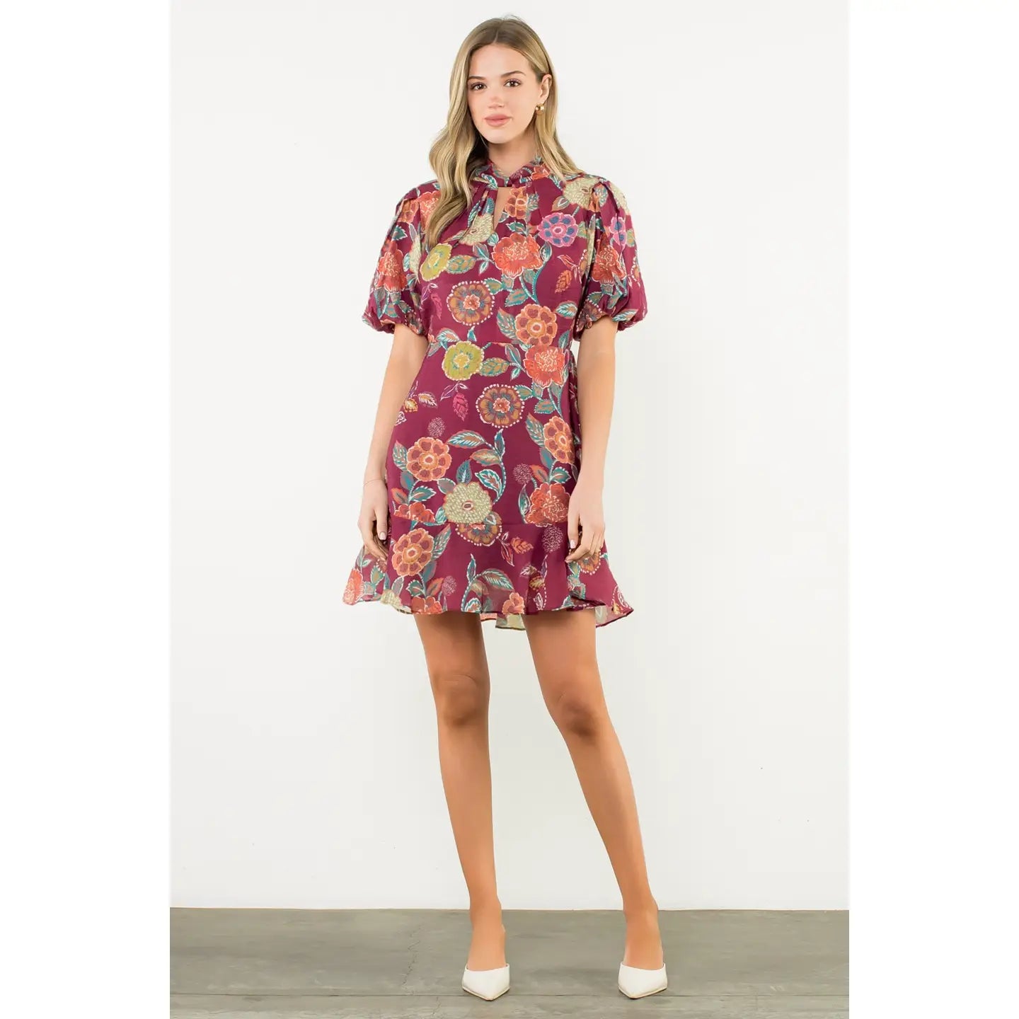 A puff sleeve floral top with a high neckline and peek-a-boo detailing at neck. Model is wearing a size small.