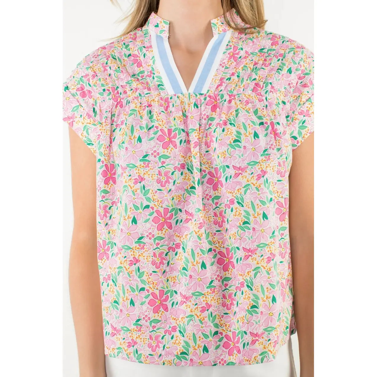 A short sleeve top with a floral design and notch neck. Model is wearing a size small.