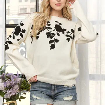A long sleeve sweater with a floral detailing. Model is wearing a size small.