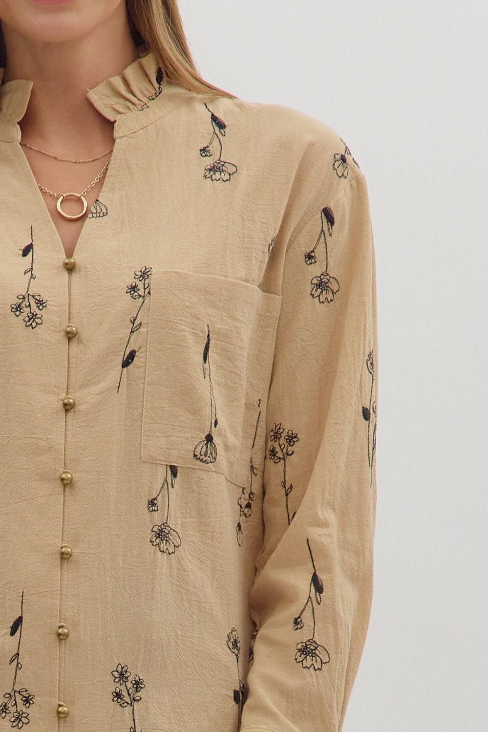 A botanical embroidery top with a button front closure and ruffled collar. Model is wearing a size small.