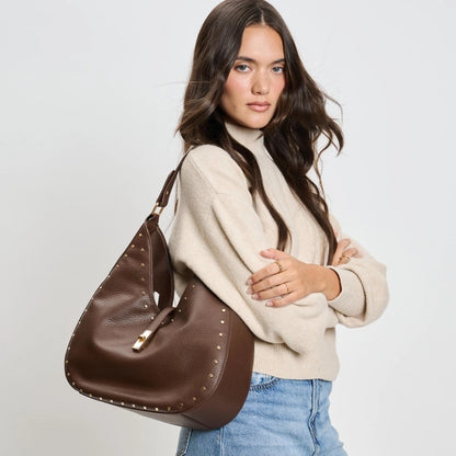 The Olvia hobo bag is made of a pebbled vegan leather and effortlessly blends edge with elegance. This bag features gold studded detailing and turn lock closure. Interior is a lined fabric with zipper pocket. Comes in 2 colors- chocolate and black.