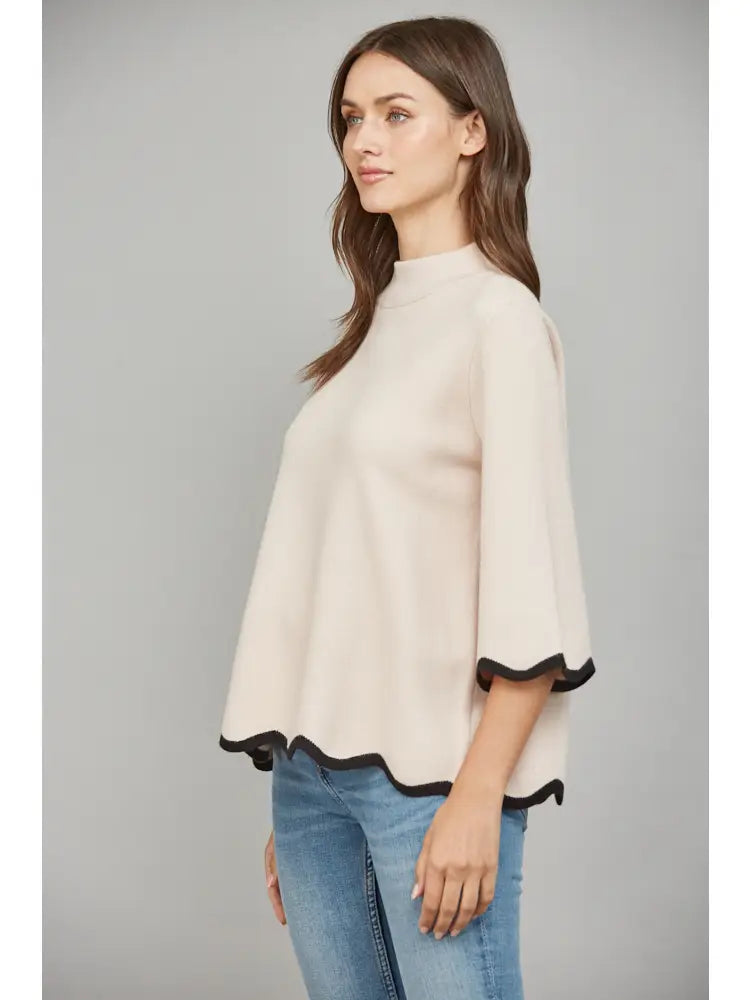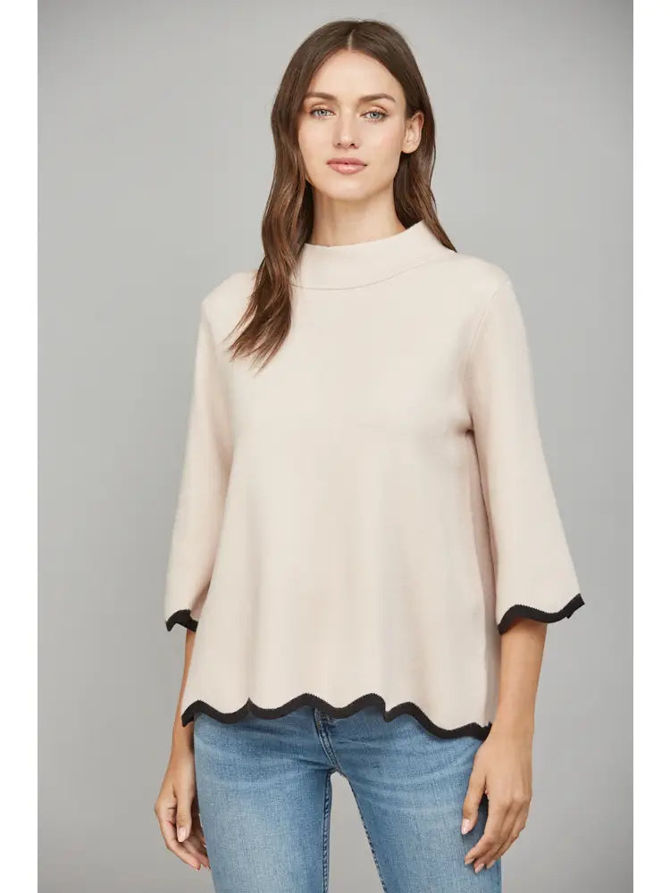 A mock neck sweater with a scallop contrast color hem detail. Model is wearing a size small.