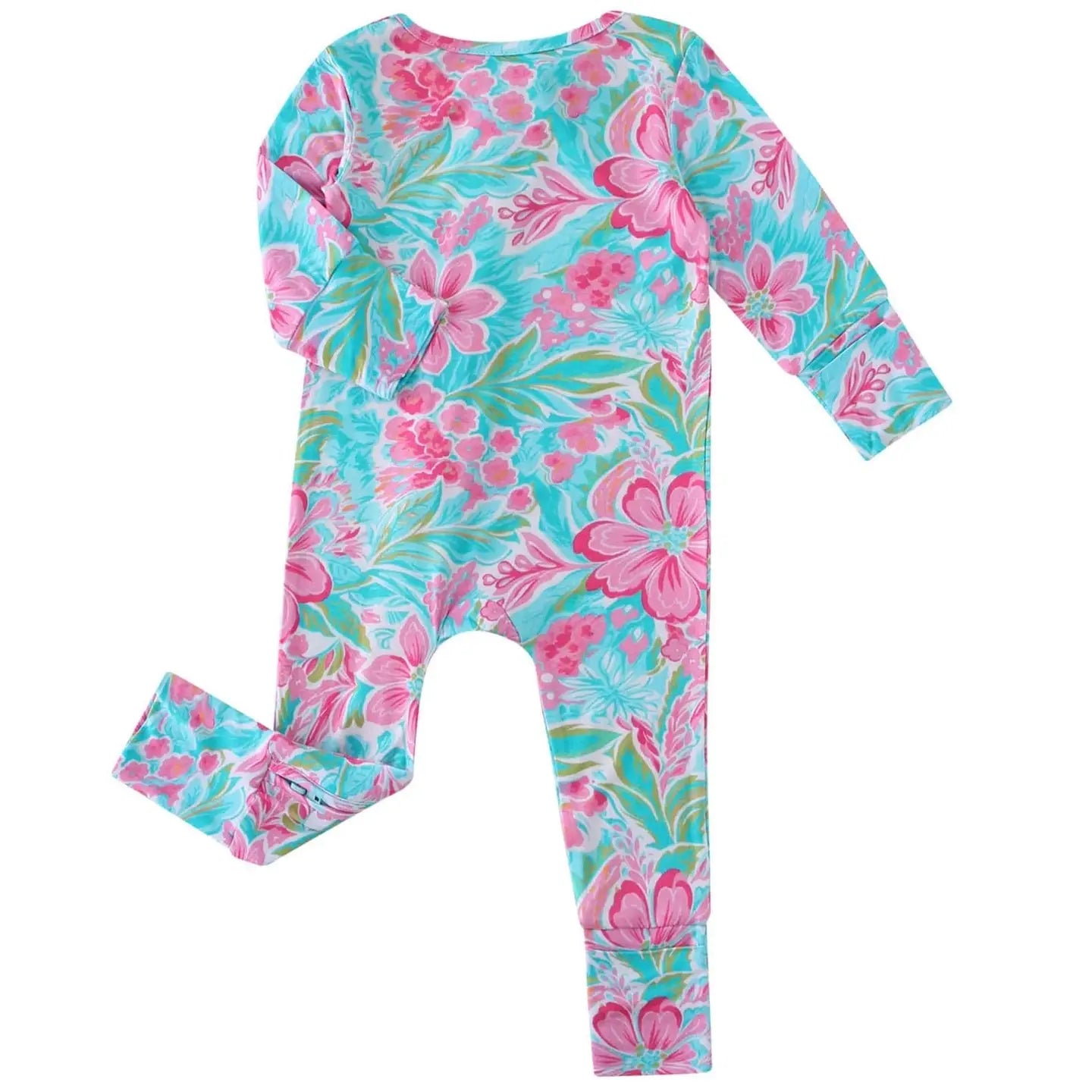 A summer floral romper with a two-way zipper, fold over mittens (up to 12-18M) and fold over foot cuffs (on all sizes). Made of 95% bamboo, 5% spandex.