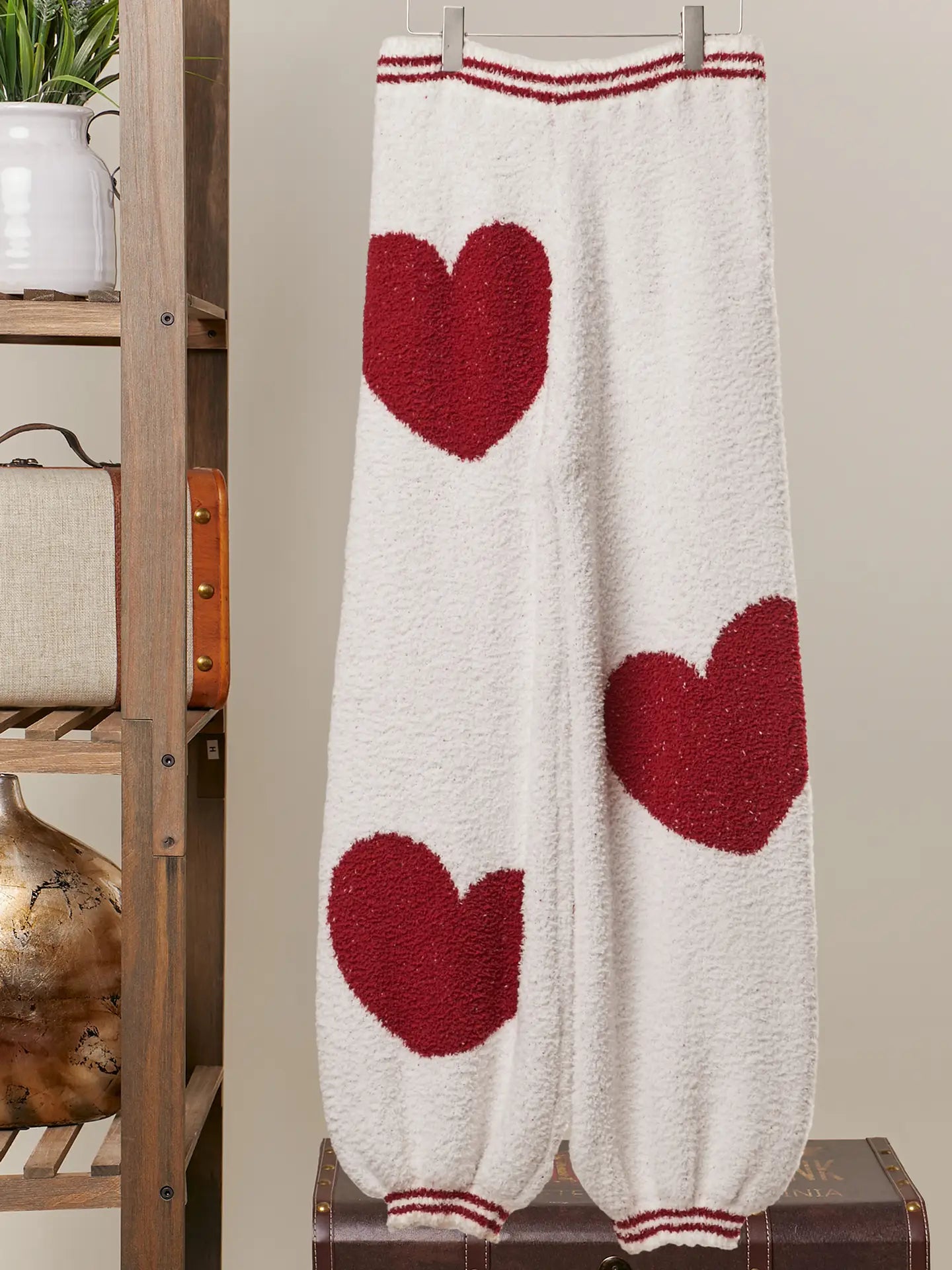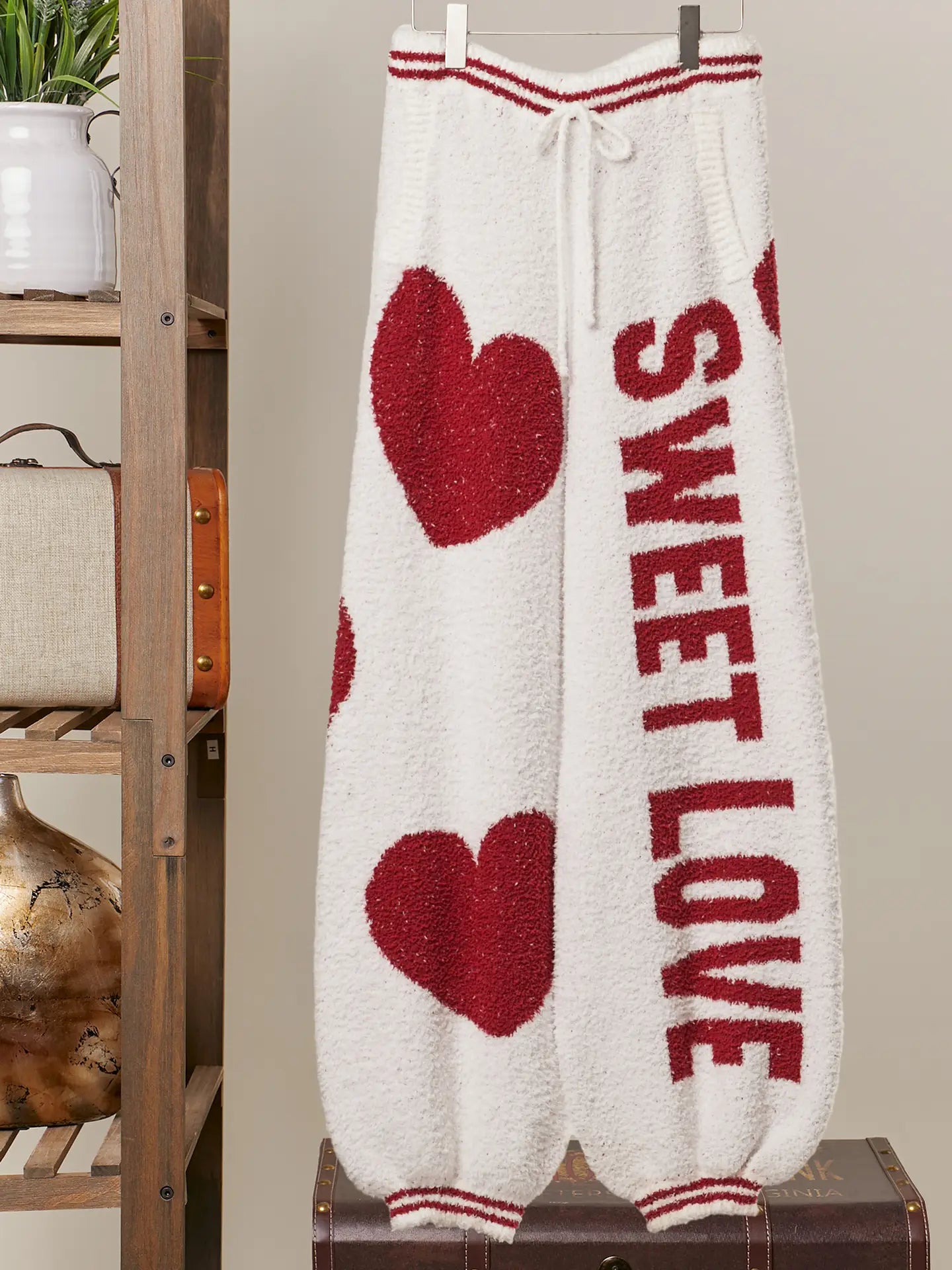 A fuzzy jogger sweatpant with red hearts and sweet love written on one leg. Model is wearing a size small.