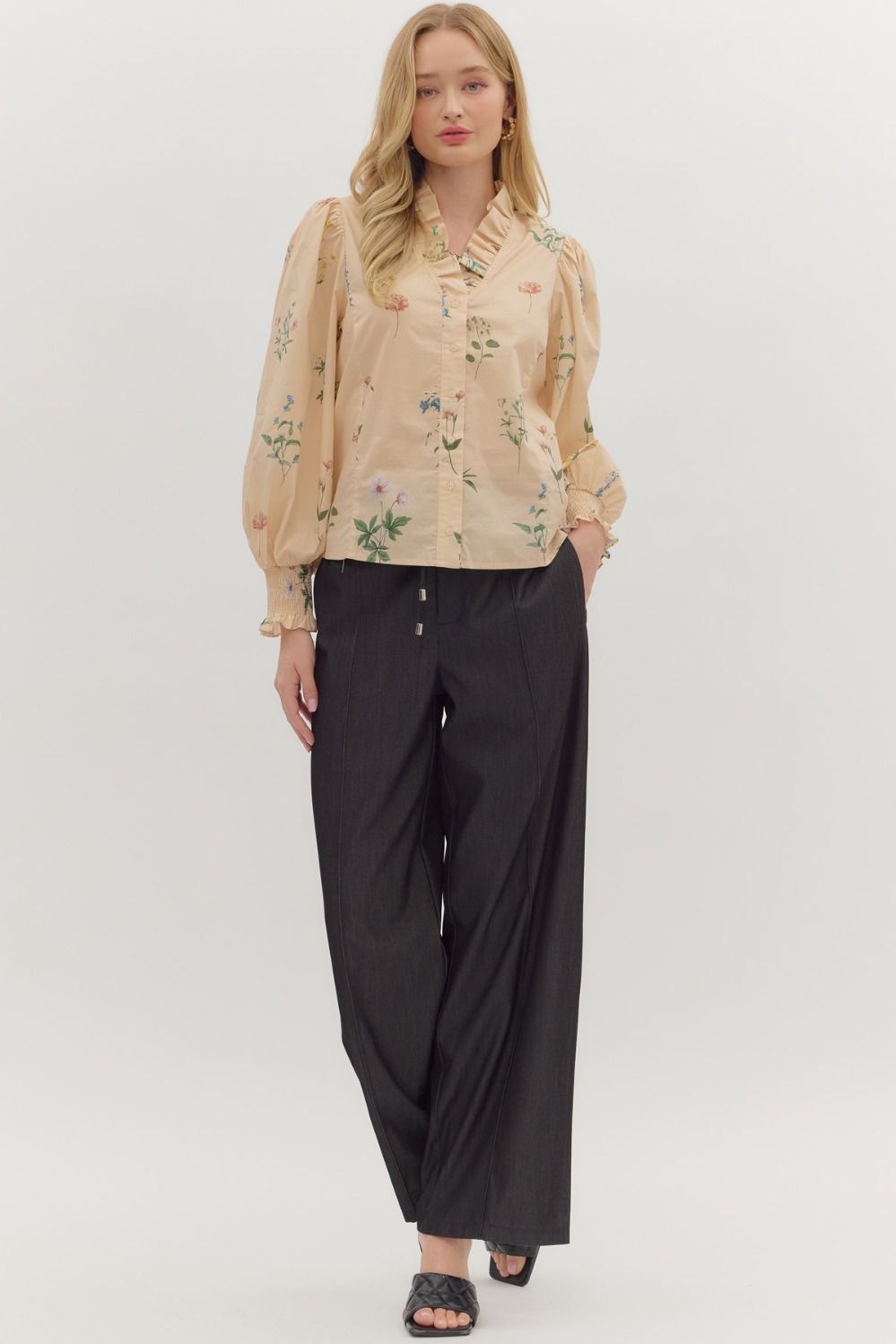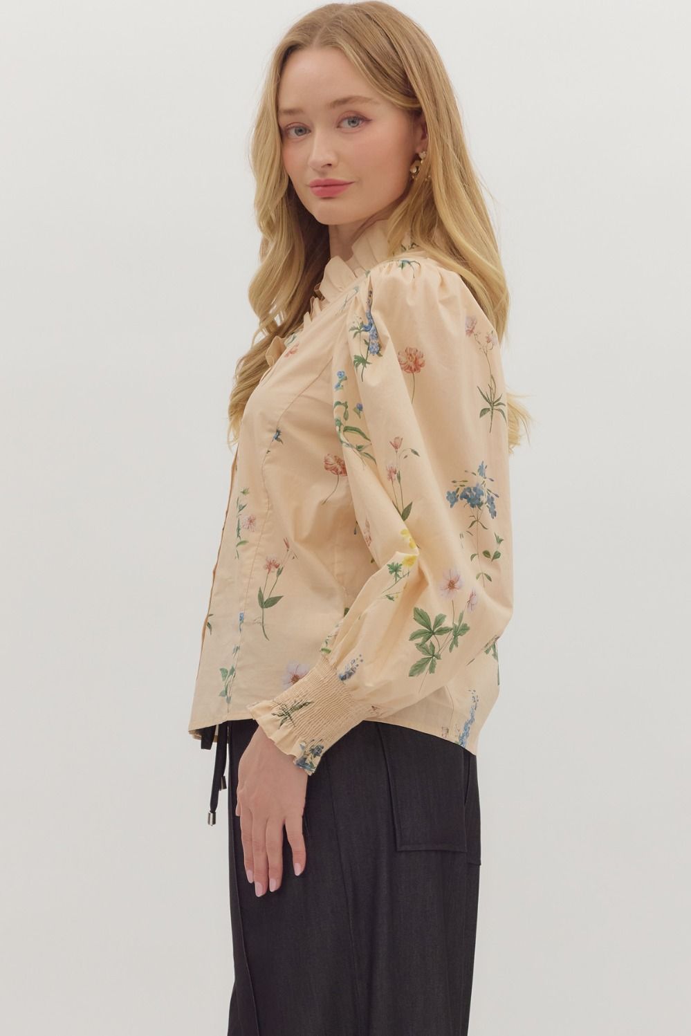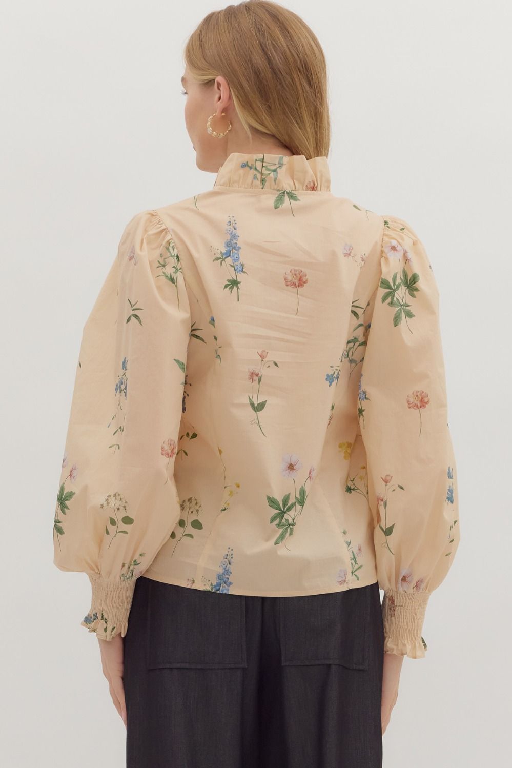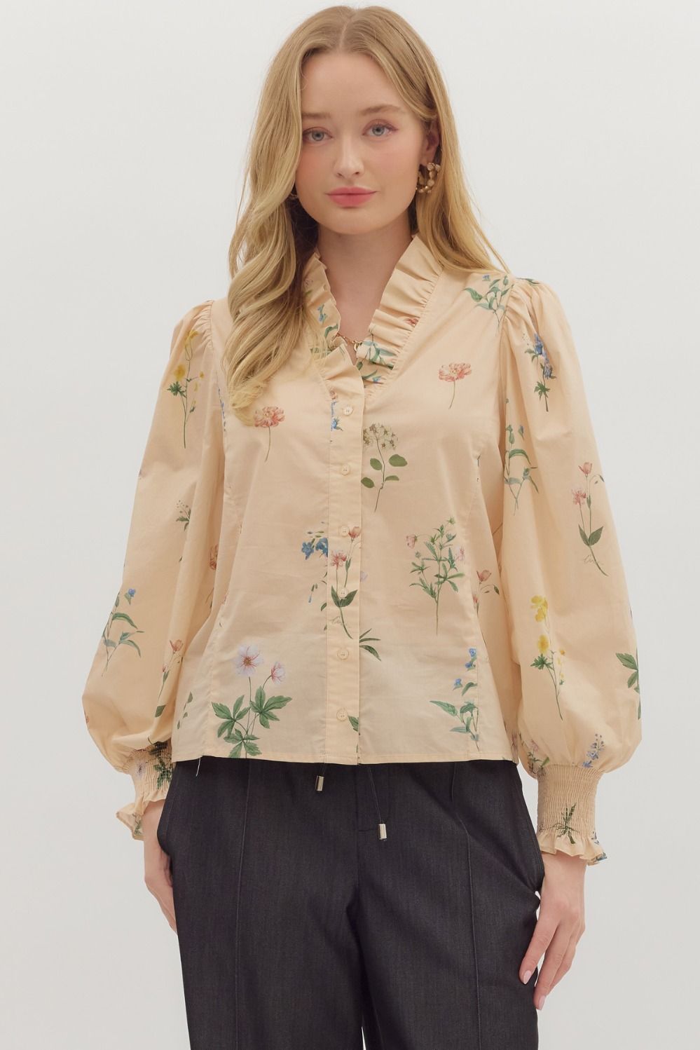A long sleeve floral smocked cuff top with a ruffle accent v-neckline with button closure. Model is wearing a size small.
