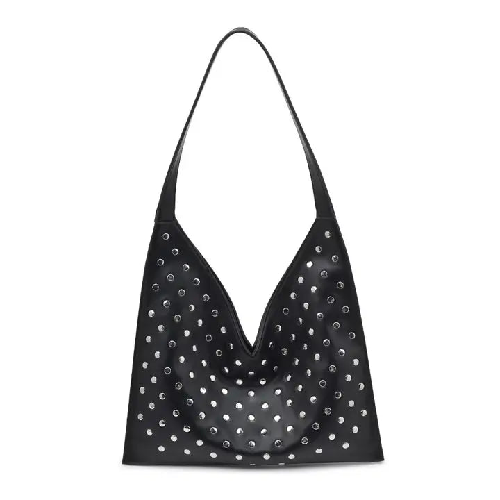 The Tori studded hobo bag is an edgy vegan leather bag featuring a studded design. This bag has a snap closure with and fabric interior lining with zipper interior pocket and two slip pockets. Comes in 3 colors- black, chocolate, and grey.