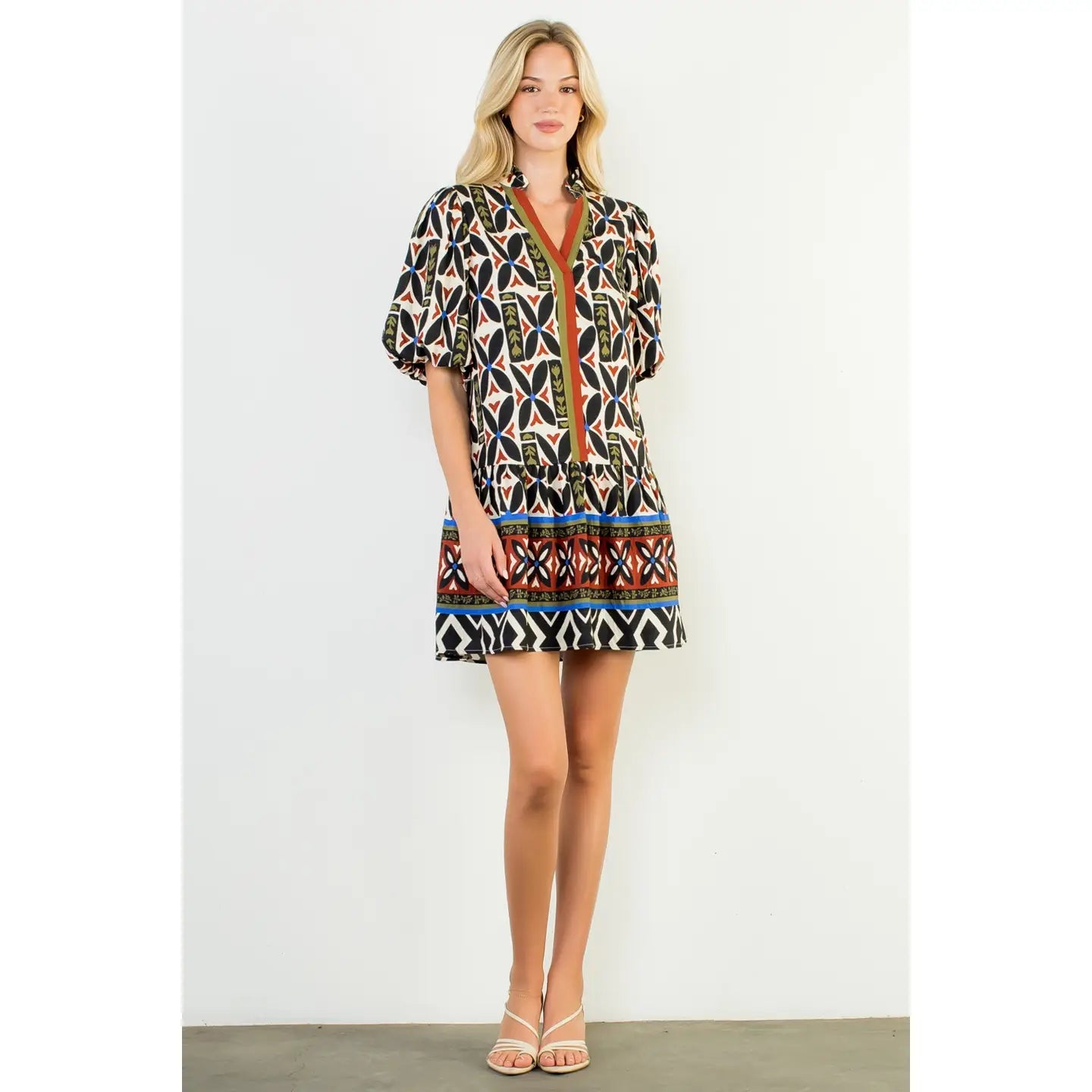 An abstract pattern print dress with a puff sleeve and v-neckline. Model is wearing a size small.